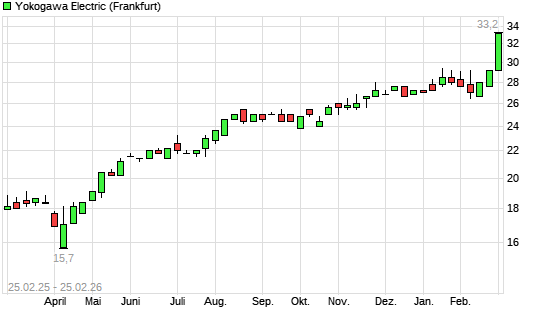 Mit dem Anstieg auf 31,00 EUR hat die Yokogawa Electric-Aktie (ISIN JP3955000009) am 24.02.2026 ein neues All-Time-High erreicht und damit den Kurs vom 14.01.2026 eingestellt.
