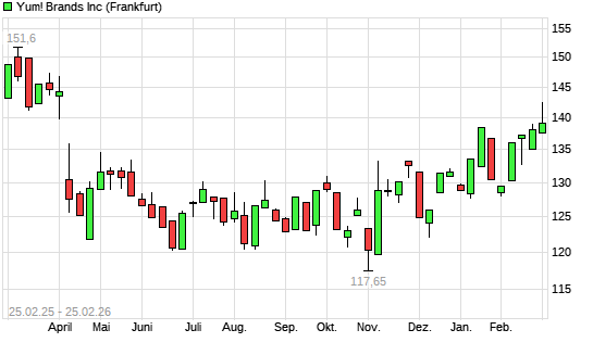 Mit dem Anstieg auf 140,50 EUR hat die Yum! Brands-Aktie (ISIN US9884981013) am 24.02.2026 ein neues 6-Monats-Hoch erreicht und damit den Kurs vom 16.01.2026 eingestellt.