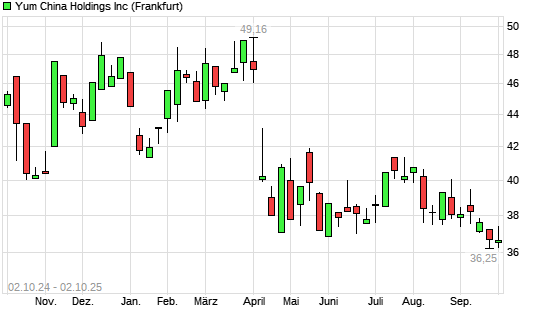 Mit dem Rücksetzer auf 36,27 EUR hat die Yum China Holdings-Aktie (ISIN US98850P1093) am 01.10.2025 ein neues 12-Monats-Tief erreicht und damit den Kurs vom 25.09.2025 eingestellt.