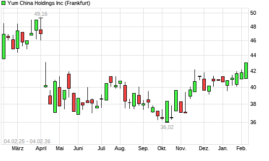 Mit dem Anstieg auf 42,44 EUR hat die Yum China Holdings-Aktie (ISIN US98850P1093) am 03.02.2026 ein neues 6-Monats-Hoch erreicht und damit den Kurs vom 20.11.2025 eingestellt.