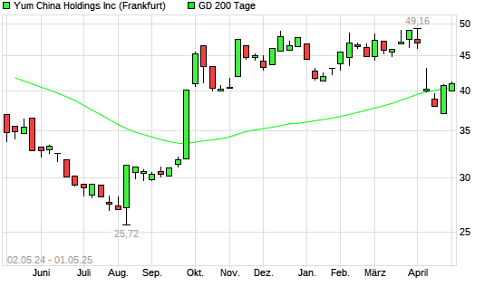 Mit dem Rücksetzer auf 41,00 EUR hat die Yum China Holdings-Aktie am 30.04.2025 die 200-Tage-Linie nach unten gekreuzt.