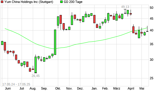 Mit dem Rücksetzer auf 39,85 EUR hat die Yum China Holdings-Aktie am 16.05.2025 die 200-Tage-Linie nach unten gekreuzt.