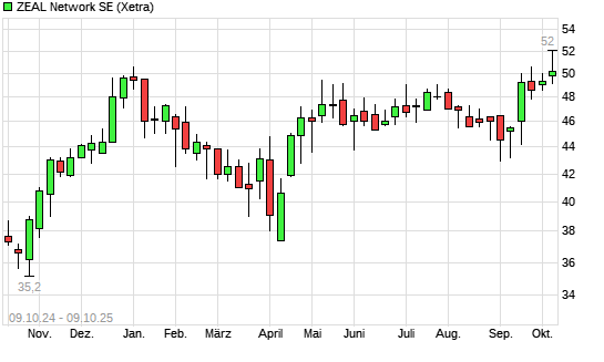 Mit dem Anstieg auf 51,60 EUR hat die ZEAL Network-Aktie (ISIN DE000ZEAL241) am 08.10.2025 ein neues 10-Jahres-Hoch erreicht und damit den Kurs vom 07.10.2025 eingestellt.