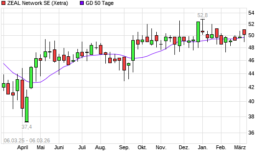 Mit dem Anstieg auf 50,00 EUR hat die ZEAL Network-Aktie am 05.03.2026 die 50-Tage-Linie nach oben gekreuzt.