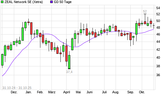 Mit dem Rücksetzer auf 47,40 EUR hat die ZEAL Network-Aktie am 30.10.2025 die 50-Tage-Linie nach unten gekreuzt.