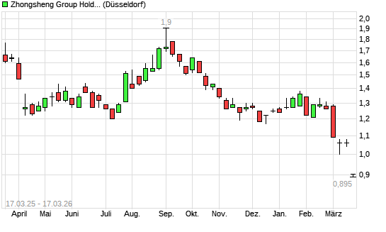 Mit dem Rücksetzer auf 0,92 EUR hat die ZHONGSHENG GRP Holding REGS-Aktie (ISIN KYG9894K1085) am 16.03.2026 ein neues 5-Jahres-Tief erreicht und damit den Kurs vom 29.08.2024 eingestellt.