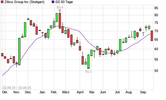 Mit dem Rücksetzer auf 66,00 EUR hat die ZILLOW GROUP-Aktie am 22.09.2025 die 50-Tage-Linie nach unten gekreuzt.