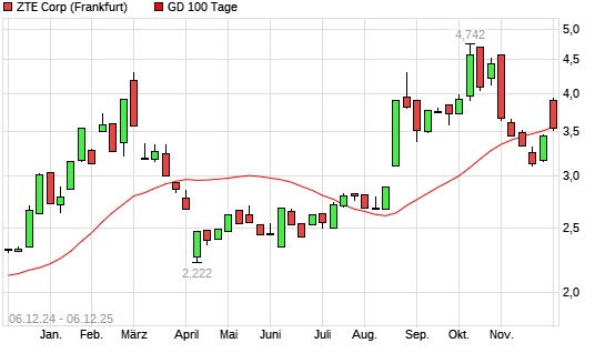 Mit dem Rücksetzer auf 3,54 EUR hat die ZTE-Aktie am 05.12.2025 die 100-Tage-Linie nach unten gekreuzt.