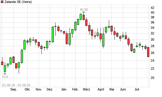 Mit dem Rücksetzer auf 25,76 EUR hat die Zalando-Aktie (ISIN DE000ZAL1111) am 31.07.2025 ein neues 6-Monats-Tief erreicht und damit den Kurs vom 23.06.2025 eingestellt.