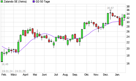 Mit dem Anstieg auf 32,52 EUR hat die Zalando-Aktie am 23.01.2025 die 50-Tage-Linie nach oben gekreuzt.