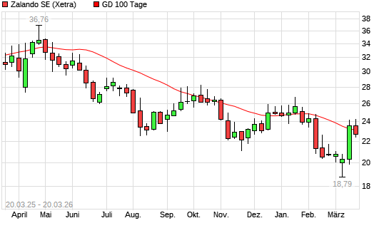 Mit dem Rücksetzer auf 22,89 EUR hat die Zalando-Aktie am 19.03.2026 die 100-Tage-Linie nach unten gekreuzt.