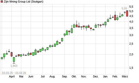 Mit dem Anstieg auf 4,98 EUR hat die Zijin Mining-Aktie (ISIN CNE100000502) am 02.03.2026 ein neues All-Time-High erreicht und damit den Kurs vom 23.02.2026 eingestellt.