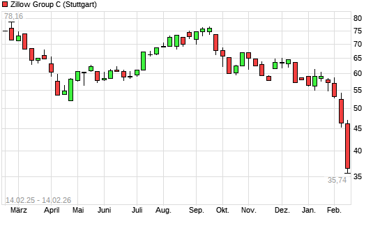 Mit dem Rücksetzer auf 36,68 EUR hat die Zillow Group C-Aktie (ISIN US98954M2008) am 13.02.2026 ein neues 12-Monats-Tief erreicht und damit den Kurs vom 12.02.2026 eingestellt.