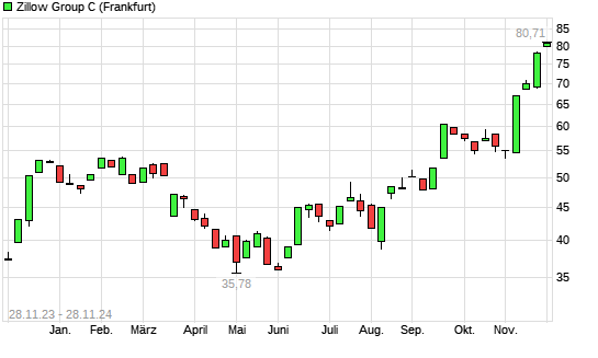 Mit dem Anstieg auf 80,54 EUR hat die Zillow Group C-Aktie (ISIN US98954M2008) am 27.11.2024 ein neues 3-Jahres-Hoch erreicht und damit den Kurs vom 26.11.2024 eingestellt.