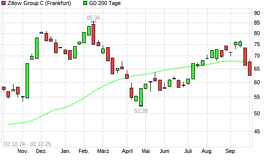 Mit dem Rücksetzer auf 65,06 EUR hat die Zillow Group C-Aktie am 01.10.2025 die 200-Tage-Linie nach unten gekreuzt.