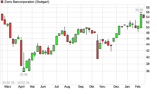 Mit dem Anstieg auf 54,49 EUR hat die Zions Bancorporation-Aktie (ISIN US9897011071) am 09.02.2026 ein neues 6-Monats-Hoch erreicht und damit den Kurs vom 06.02.2026 eingestellt.