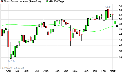 Mit dem Rücksetzer auf 47,15 EUR hat die Zions Bancorporation-Aktie am 12.03.2026 die 200-Tage-Linie nach unten gekreuzt.