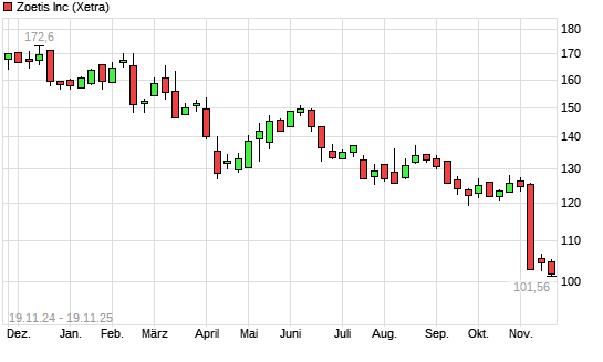 Mit dem Rücksetzer auf 101,80 EUR hat die Zoetis-Aktie (ISIN US98978V1035) am 18.11.2025 ein neues 5-Jahres-Tief erreicht und damit den Kurs vom 07.11.2025 eingestellt.