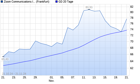 Mit dem Rücksetzer auf 73,20 EUR hat die Zoom Video Communications-Aktie am 20.11.2024 die 20-Tage-Linie nach unten gekreuzt.