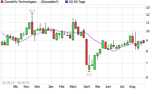 Mit dem Anstieg auf 8,90 EUR hat die ZoomInfo Technologies-Aktie am 25.08.2025 die 50-Tage-Linie nach oben gekreuzt.