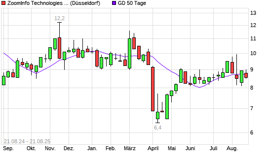 Mit dem Rücksetzer auf 8,55 EUR hat die ZoomInfo Technologies-Aktie am 20.08.2025 die 50-Tage-Linie nach unten gekreuzt.