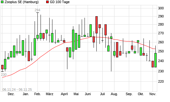 Mit dem Anstieg auf 256,00 EUR hat die Zooplus-Aktie am 05.11.2025 die 100-Tage-Linie nach oben gekreuzt.