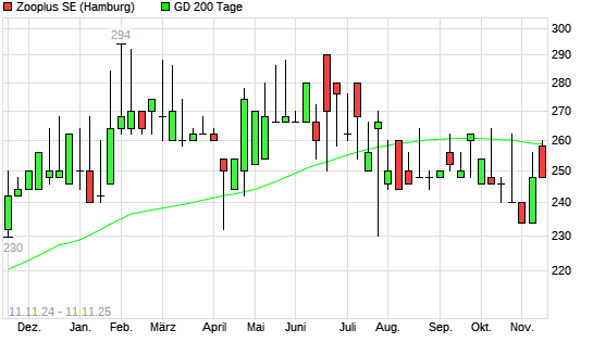 Mit dem Anstieg auf 260,00 EUR hat die Zooplus-Aktie am 10.11.2025 die 200-Tage-Linie nach oben gekreuzt.