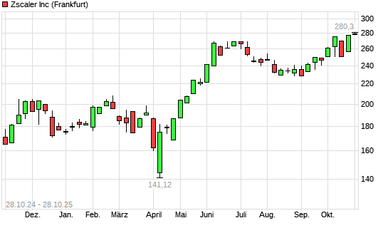 Mit dem Anstieg auf 279,60 EUR hat die Zscaler-Aktie (ISIN US98980G1022) am 27.10.2025 ein neues 3-Jahres-Hoch erreicht und damit den Kurs vom 24.10.2025 eingestellt.