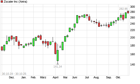 Mit dem Anstieg auf 282,55 EUR hat die Zscaler-Aktie (ISIN US98980G1022) am 29.10.2025 ein neues 3-Jahres-Hoch erreicht und damit den Kurs vom 27.10.2025 eingestellt.