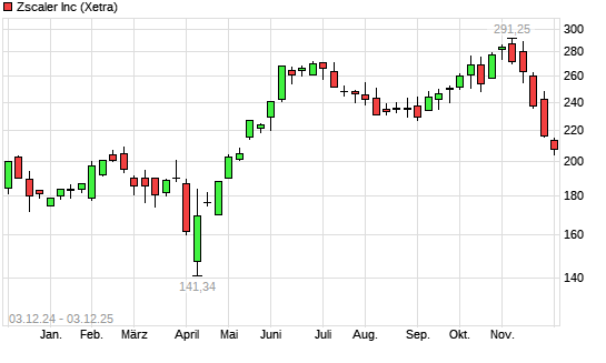 Mit dem Rücksetzer auf 208,45 EUR hat die Zscaler-Aktie (ISIN US98980G1022) am 02.12.2025 ein neues 6-Monats-Tief erreicht und damit den Kurs vom 01.12.2025 eingestellt.