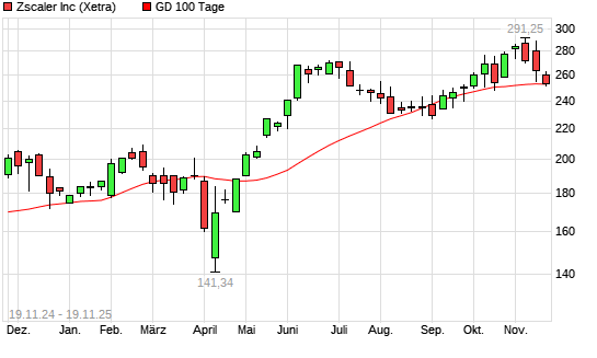 Mit dem Rücksetzer auf 251,30 EUR hat die Zscaler-Aktie am 18.11.2025 die 100-Tage-Linie nach unten gekreuzt.
