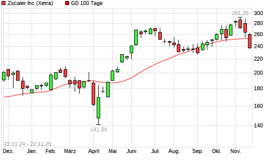 Mit dem Rücksetzer auf 241,90 EUR hat die Zscaler-Aktie am 21.11.2025 die 100-Tage-Linie nach unten gekreuzt.