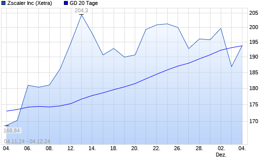 Mit dem Rücksetzer auf 183,10 EUR hat die Zscaler-Aktie am 03.12.2024 die 20-Tage-Linie nach unten gekreuzt.