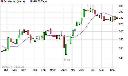 Mit dem Rücksetzer auf 241,10 EUR hat die Zscaler-Aktie am 15.09.2025 die 50-Tage-Linie nach unten gekreuzt.