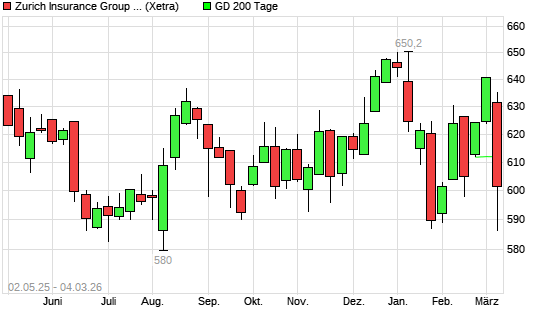 Mit dem Rücksetzer auf 587,20 EUR hat die Zurich Insurance Group-Aktie am 03.03.2026 die 200-Tage-Linie nach unten gekreuzt.