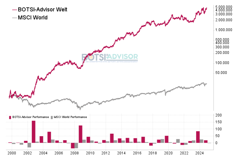 Sie sind herzlich eingeladen, sich noch heute für einen unverbindlichen Gratis-Login anzumelden und das vom BOTSI®-Advisor regelbasiert gesteuerte Musterportfolio ganz einfach nachzubilden. Hier können Sie die boerse.de-Signale Aktien Welt kostenlos kennenlernen.