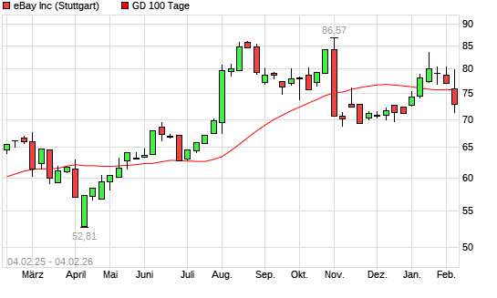 Mit dem Anstieg auf 79,38 EUR hat die eBay-Aktie am 03.02.2026 die 100-Tage-Linie nach oben gekreuzt.