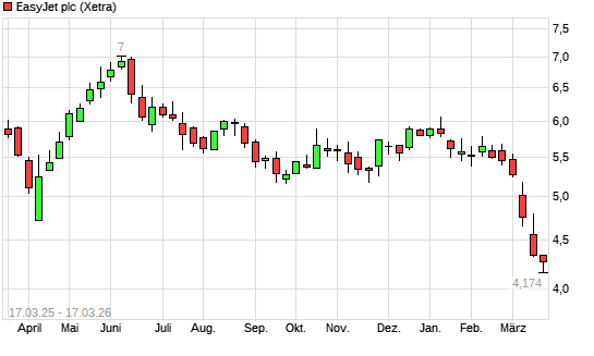 Mit dem Rücksetzer auf 4,29 EUR hat die easyJet Airline-Aktie (ISIN GB00B7KR2P84) am 16.03.2026 ein neues 12-Monats-Tief erreicht und damit den Kurs vom 13.03.2026 eingestellt.