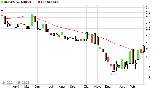 Mit dem Rücksetzer auf 1,69 EUR hat die hGears-Aktie am 24.02.2025 die 100-Tage-Linie nach unten gekreuzt.