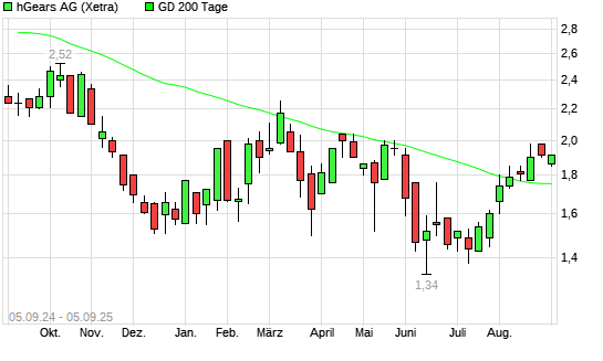 Mit dem Rücksetzer auf 1,45 EUR hat die hGears-Aktie am 04.09.2025 die 200-Tage-Linie nach unten gekreuzt.