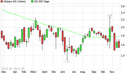 Mit dem Rücksetzer auf 1,21 EUR hat die hGears-Aktie am 19.11.2025 die 200-Tage-Linie nach unten gekreuzt.