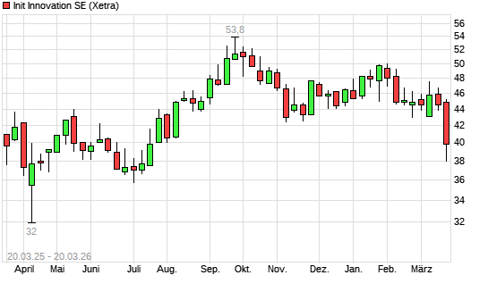 Mit dem Rücksetzer auf 40,00 EUR hat die init innovation-Aktie (ISIN DE0005759807) am 19.03.2026 ein neues 6-Monats-Tief erreicht und damit den Kurs vom 18.11.2025 eingestellt.