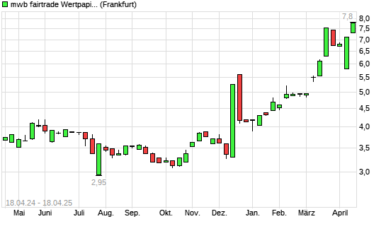 Mit dem Anstieg auf 7,80 EUR hat die mwb fairtrade Wertpapierhandelsbank-Aktie (ISIN DE000A3EYLC7) am 17.04.2025 ein neues 12-Monats-Hoch erreicht und damit den Kurs vom 14.04.2025 eingestellt.