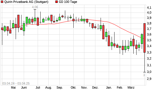 Mit dem Anstieg auf 3,62 EUR hat die quirin bank-Aktie am 02.04.2025 die 100-Tage-Linie nach oben gekreuzt.