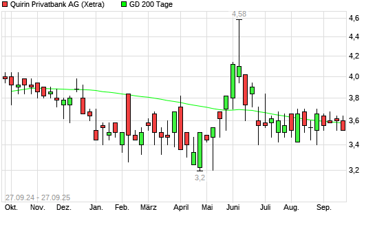 Mit dem Rücksetzer auf 3,40 EUR hat die quirin bank-Aktie am 26.09.2025 die 200-Tage-Linie nach unten gekreuzt.
