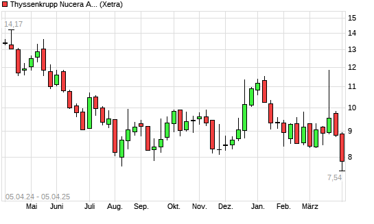 Mit dem Rücksetzer auf 8,03 EUR hat die thyssenkrupp nucera AG-Aktie (ISIN DE000NCA0001) am 04.04.2025 ein neues 6-Monats-Tief erreicht und damit den Kurs vom 15.11.2024 eingestellt.