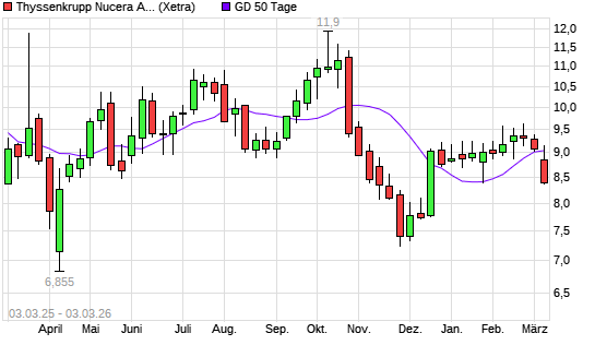 Mit dem Rücksetzer auf 9,05 EUR hat die thyssenkrupp nucera AG-Aktie am 02.03.2026 die 50-Tage-Linie nach unten gekreuzt.