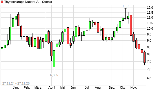Mit dem Rücksetzer auf 7,30 EUR hat die thyssenkrupp nucera AG-Aktie (ISIN DE000NCA0001) am 26.11.2025 ein neues All-Time-Low erreicht und damit den Kurs vom 25.11.2025 eingestellt.Die ...weiterlesen