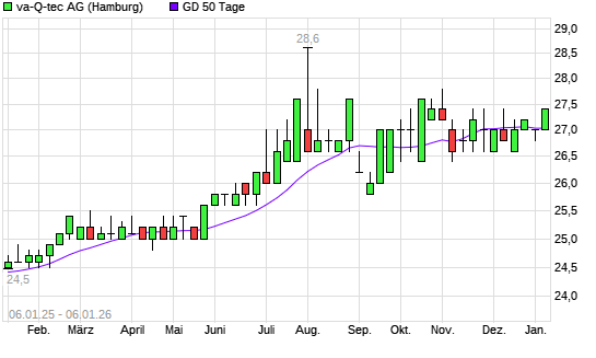 Mit dem Anstieg auf 27,20 EUR hat die va-Q-tec-Aktie am 05.01.2026 die 50-Tage-Linie nach oben gekreuzt.