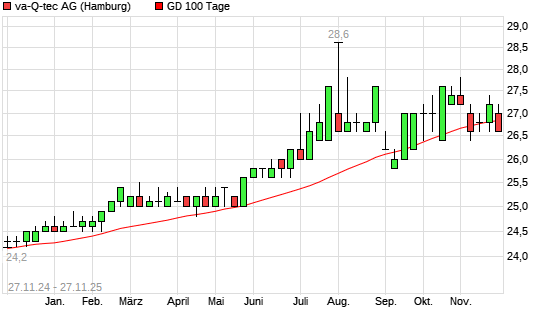 Mit dem Rücksetzer auf 26,60 EUR hat die va-Q-tec-Aktie am 26.11.2025 die 100-Tage-Linie nach unten gekreuzt.